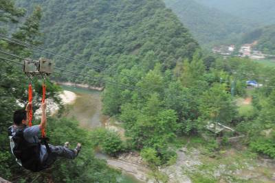 空中飞降 系好安全带,一下子飞越深渊险峡,在一路下滑的过程就是体验飞翔的过程,这是7月13日,众多襄樊市民在南漳县美丽的鱼泉峡谷体验最刺激有健身运动--飞降。南漳鱼泉谷飞翔俱乐部充分利用省级旅游名村的自然资源,让广大游客飞越峡谷,体验拓展运动、滑草、河流、吃农饭、品农家特产等生态旅游业的魅力。