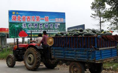 国家级农业标准化示范区湖北省宜城市流水西瓜大上市。图为丰收的瓜农喜售西瓜。汤伟峰王晓丽摄