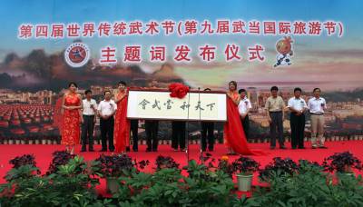 13日上午,由十堰市市委、市政府主办的第四届世界传统武术节(第九届武当国际旅游节)主题词发布仪式在该市人民广场隆重举行。市委副书记、代市长周霁宣布主题词”会武当,和天下”并揭牌。市领导张维国、陈冬芝、师永学、刘学勤、黄剑云、杨立志等出席发布仪式。市委常委、副市长张维国在发布仪式上说,主题词是武术节的灵魂,第四届世界传统武术节主题词凝聚着全国各地、社会各界人士的热情和关注、智慧和心血。在主题词征集公告发布后的短短半个月内,就收到应征作品8016条。后经初选初评确定了10件作品提交公众投票,社会各界群众通过网络、声讯、短信等方式共投票129668张,结合公众投票,经专家评审委员会评审,最终评选出本届武术节主题词”会武当,和天下”。□链接”会武当,和天下”创意说明武当山是世界道教圣地,也是太和之源。”和”,古今皆崇,它是道教文化和太极文化之宗。我市举办第四届世界传统武术节,对促进世界和平、人间大同具有重要意义。