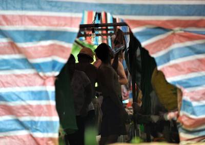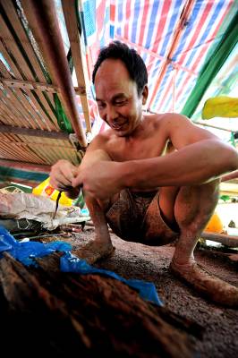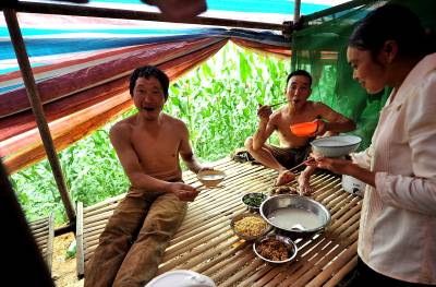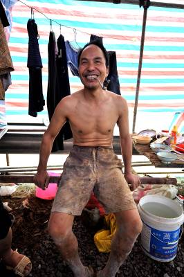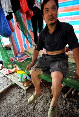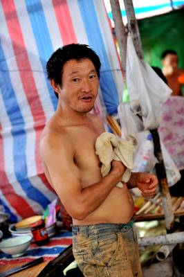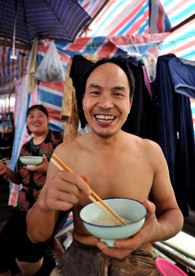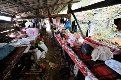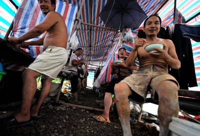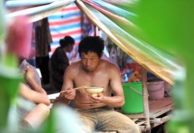 14日中午,209国道宣恩县境内一处因受连日暴雨灾害垮塌的抢险工地,工人们在闷热的天气里,在仅用一层蓝白相间的塑料布搭起的”蜗居”里吃饭、休息。当灾害来袭时,人们会万众一心解一时之难。然而灾害过后,大量的工作需要这些生活在临时”蜗居”里的工人们去”善后”,于是在受灾现场,就会有无数个”蜗居”,生活在这里的人们,为了灾后恢复工作,需要忍受狂风暴雨或是烈日下高温,用他们的汗水,去修复灾害留下的创伤。本报视界网宋文摄