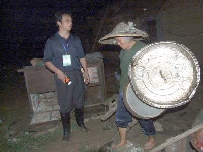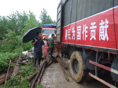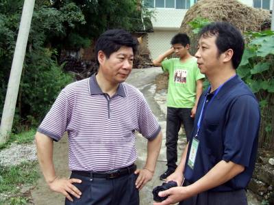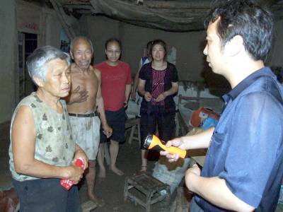 湖北省郧县是南水北调中线工程核心水源区,有30264名移民将外迁安置.自开展大规模移民以来,郧县己有6批4000多移民迁往600公里外的安置地.7月11日第7批131户574名移民将从安阳镇3个村迁往仙桃市杨林尾镇移民新村.10日是移民搬家装车的时间,一大早7.30分笔者随车冒雨赶到安阳镇居峪村跟随督导组开始工作,将镜头对准了郧县移民指挥部督导组副组长,郧县县委组织部副部长江庆朝,江庆朝抵达装车现场换上水鞋后,打着雨伞沿移民装车公路向里巡查不时与现场林业局工作队员打招呼,询问移民搬家装车情况,有什么困难和问题,并踩着稀泥深入移民家中调查了解情况.临近中午又踩着稀泥来到槐树村询问移民工作队送午饭了没有,并挨家走访移民,向他们讲解什么东西值得搬,什么东西可以不搬,怎样节约等问题.下午江庆朝又来到陈营村装车现场,走访移民搬迁家庭,与行管局局长工作队队长曹宁国见面了解装车情况和移民晚饭安排情况.晚饭后江庆朝又带领督导组打着手电再一次来到居峪村,槐树村,陈营村走访移民吃晚饭没有?晚上怎样安排休息?工作队干部在忙些啥?明天早晨5点起床上车是否能起来?并看望了集中在居峪中学休息的移民们,当江庆朝的督导组离开陈营村时己是夜里12点钟了,第二天早晨5点江庆朝的督导组又出现在搬迁移民上车现场与工作队一起为移民们送行.图1为江庆朝在居峪村移民搬家装车现场冒雨巡查时的情景.图2为江庆朝(右)在陈营村与移民交谈时的情景.图3为江庆朝(右)在陈营村与工作队队长,行管局局长曹宁国交流现场装车和移民晚饭安排情况时的情景.图4为8.20分江庆朝(左)在陈营村为槐树村1组65岁移民郭春兰搬东西照亮时的情景.图5为8.40分江庆朝(右)在居峪村9组与72岁移民郭成兰一家亲切交谈时的情景.周家山杨文华摄湖北省郧县城建监察大队电话13872840078邮编