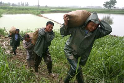 7月14日中午,12:10分,大雨下个不停仙桃市西流河镇庆河村,该村100余名防汛护堤抢险员正抢抓时间将包扎好的”泥土包”运往庆丰堤,一派热火朝天的场面,这已是强降雨以来,他们奋战的第四个昼夜了。