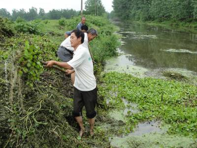 14日,沙洋县李市镇西荆河村7名村民正用铁耙捞摇把河里的杂草,以加快泵站排水。从7月8日开始,李市镇降雨量达220.6毫米,该镇班子成员放弃节假日,每人承包一处泵站,进行定点值班、全天候排涝。目前,全镇共启动大小排涝泵站12处,装机容量2300千瓦,排涝1435.2万立方米,并组织350人次劳力对各渠道进行除障。