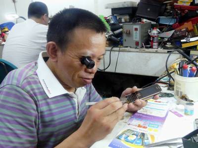 7月14日下午4点多钟,武汉市江汉区残疾人创业(培训手机维修培训部)武汉市焦点通讯器材经营部高级工程师徐明新,正在为客户抢修手机,当日上午8点至下午5点,己抢修了30余部。