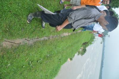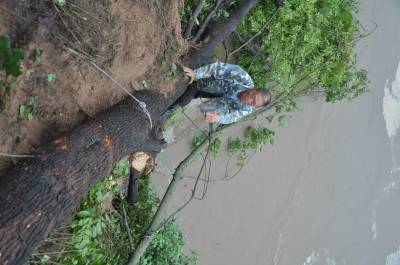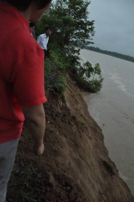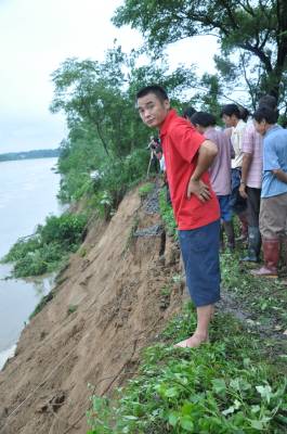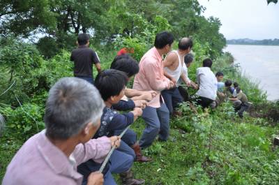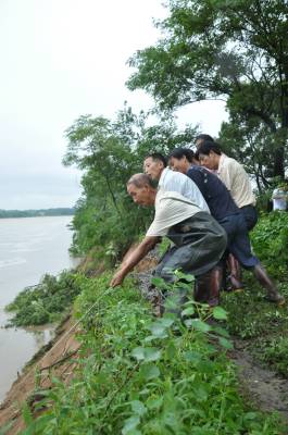 紧急排险。7月14日,受上游突降”坨子雨”影响,湖北省蕲春县境内干流——蕲河的水位陡涨。下午3时许,该县蕲河关河地段发生堤坝崩塌险情,500余米的堤坝发生塌方。接到险情报告后,当地党委、政府紧急组织群众采取伐树护堤、打桩灌包的方法排除险情,截至当晚8时,该处险情基本排除。(本报视窗网余立鹏摄)