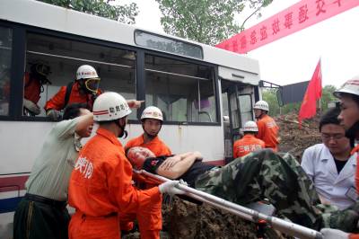 ”交警、交警,三峡枢纽局大客车在江峡一路东园段遇山体塌方,车辆被埋,车内起火冒烟,9名乘客被困,请救助,请救助。”7月15日10时,三峡坝区交警接到群众紧急报警。随后,一场声势浩大的救援行动就此展开:长江三峡枢纽突发事件应急救援总队300余人携带各型装备,火速赶赴现场;经过25分钟的努力,全部被困人员成功获救,救援行动获得成功。据了解,这是长江三峡枢纽突发事件应急救援总队成立后,第一次进行重大交通突发事故实战演练。本报记者全程直击了这场规模宏大、别具一格的演练。
