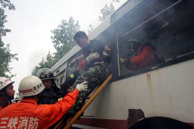 山体滑坡,客车被困,车体起火,300名救援人员紧急出击——三峡坝区昨首演重大车祸救援
