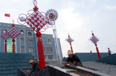 ”鄂西屋脊”靓装促高山旅游7月15日,两名工人正在大红中国结下最后施工,至此巴东县绿葱坡镇中心广场建设已接近尾声,当地人民劳作之余将有新去处。绿葱坡镇地处海拔1800米的高山地区,素有”鄂西屋脊”之称,曾经因一条茅屋街让路人不愿意久留。近几年,该镇经济社会全面进步,镇政府先后投资300多万元兴修了广场、硬化了道路,安装了路灯,全面提升了集镇品味。巴东县从2009年起把以绿葱坡为中心的高山旅游纳入全县经济发展的重头,计划把绿葱坡镇打造成恩(施)神(农架)旅游线的重要接点。田植峰摄