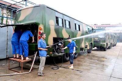 湖北省三环集团公司武汉客车厂6、7两个月生产军品(不含其它产品)创产值一千三百多万元,人均产值二十九万多元。该厂生产的消毒洗消车曾在汶川、玉树地震灾区为救援部队官兵和救援人员洗消发挥着巨大的作用,玉树地震后,部队又紧急追加了一批一千三百多万元的订货任务,接到订单后及时调整生产结构,组织员工加班加点进行生产。图为员工正在作产品的最后调试工作,7月底按期交付部队。