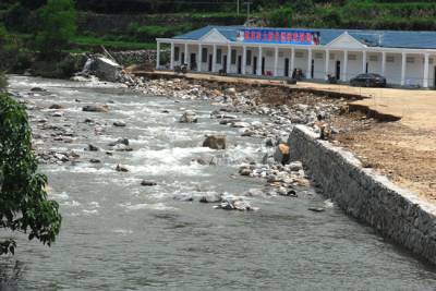 自7月8日以来,大别山区连降大暴雨,给大别山各大景区造成了重大损失,旅游公路路面水毁里程35公里,游步道冲毁14公里,漂流河道护坡冲垮10多处,毁坏河段10余公里,直接经济损失达7000多万元.这是英山县桃花冲景区的一个受损景点.