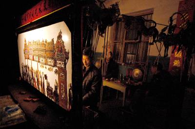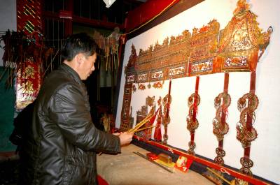 皮影技艺的坚守者湖北房县皮影戏山越调唱腔传人刘兴龙和他的皮影戏在湖北房县军店有一个皮影戏民间艺人,在当地因为是山越调唱腔皮影戏传人,远近闻名,他就是山越调唱腔皮影戏传人刘兴龙。几经周折之后我们一行五人驱车专程来到房县军店,在他们的家里见到了山越调唱腔皮影戏传人刘兴龙。对我们的到来,刘兴龙及家人十分热情。他告诉我们,他和他的叔叔刘安朝是山越调唱腔皮影戏传人,叔侄俩都是从他们的长辈那里学习和传承了皮影戏技艺,是山越调唱腔的传承者,到刘兴龙这代已经是第十代传人了。目前他和刘安朝、李祖学三人组合。谈到最近皮影戏的演出情况,刘兴龙粗略地算了一下仅春节前后,就有接到了近三百多场次的演出预约,一般每天晚上都是连续三场,已经演出了一百多场了。刘兴龙告诉我们,他用的所有人物车马道具都是用牛皮制作而成,其中有不少的道具还是他自己亲手绘画、制作的。刘兴龙介绍:对皮影戏表演有很高的要求,表演者除了要能一人控制三、四个影人的动作,还要密切配合场上的配乐,兼顾旁白,唱腔。由于皮影戏中的车船马轿、奇妖怪兽都能上场,飞天入地、隐身变形、喷烟吐火、劈山倒海都能表现,还能配以各种皮影特技操作和声光效果,演皮影戏的操耍技巧和唱功,是皮影戏班水平高低的关键。而操耍和演唱都是经师父心传口授和长期勤学苦练而成的。在演出时,艺人们都有操纵影人、乐器伴凑合道白配唱同时兼顾的本领。在刘兴龙、刘安朝和李祖学的三人组合中,刘安朝是鼓伴,李祖学是琴师,同时又具备吹拉弹唱等多项技能,刘兴龙则具体操纵所有戏人,三人可谓最佳搭档。正所谓:三两步走尽天下,无五七人百万雄兵。虽然如此,但刘兴龙表演皮影戏的设备却非常轻便,所有的家当用两个大箱子就能盛下,说走即走,行动十分便利。演出场地也不必讲究,不论在大厅、广场、庭院道场以至普通室内,只要能架起影窗布幕和灯箱就能开戏。刘兴龙边跟我们聊天,边开始搭台,从拉绳、搭台,架影窗布幕,到挂好所有人物道具,前后不过四十分钟左右,所以,机动性很强。一个戏班三、五个人和一箱影人就能演四、五十出戏。所以皮影戏自古就是随军的一种娱乐形式,也是广泛流传、普及于民间的原因之一。谈到以后皮影戏传承问题时,已经不惑之年的刘兴龙表现出一丝的忧虑。但随后他说准备让自己尚读中学的儿子将来毕业后跟着自己学习皮影戏,他不希望让老祖宗传下来的皮影技艺在自己手上失传。皮影戏,顾名思义,它是一种以牛皮、驴皮制作成戏中各类人物,利用剪影的形式来表演故事的戏曲。演出时用灯亮将其射在幕上,艺人在幕后操纵并演唱。音乐为高腔,分文武场。文场主弦是四弦胡琴或京二胡,辅以三弦、月琴、唢呐;武场用的是土鼓、大寺锣、小土锣、大叶钹和马锣。唱腔有”上獠子”、”下獠子”、”武獠子”、”文獠子”、”哭汉江”、”四平腔”等声腔及民间小调,声色古朴、粗犷、深厚,充满浓郁的乡土气息。据资料记载,皮影戏发源于我国西汉时期的陕西华县(古华州),距今已有两千多年的历史,是世界上最早由人配音的活动影画艺术,有人认为皮影戏是现代”电影始祖”。由于皮影戏在我国流传地域广阔,在不同区域的长期演化过程中,其音乐唱腔的风格与韵律都吸收了各自地方戏曲、曲艺、民歌小调、音乐体系的精华,从而形成了溢彩纷呈的众多流派,仅在秦、晋、豫一带的各路皮影流派中就有十多种唱腔,山越调唱腔属于安康越调类。(视界网叶桓齐海燕)