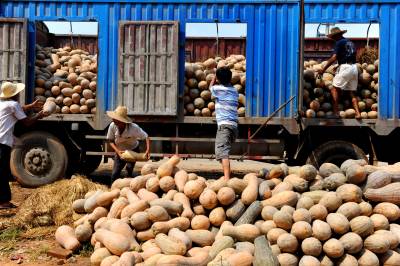 16日,嘉鱼县渡普镇杨家咀村的村民在装南瓜,准备销往重庆。连日的大暴雨使本村的南瓜、冬瓜损失惨重。本村南瓜、冬瓜种植面积2500亩,是种瓜的传统村,正常年景每亩收成约2000元,今年的洪灾亩平收入约100元。村民抢收成熟南瓜、冬瓜外销,就是要把损失降到最低,也为政府减轻负担。记者郑元昌摄