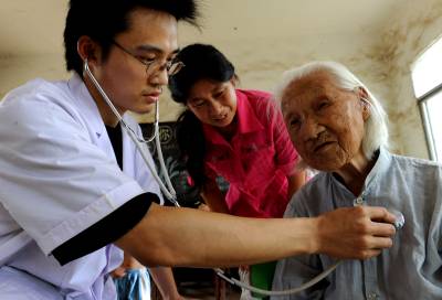 16日,咸安区紫潭村99岁的吕桂香老太在灾民安置点接受医生的体检。洪灾发生后,咸安区抽派大批医务工作者下到灾区和灾民安置点,义务为灾民看病治病。记者郑元昌视界网吴涛摄