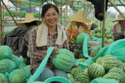 荆州区菱角湖管理区在调整农业产业结构中,充分发挥土地资源的优势,引导农工由种植棉花等传统作物转向种植西瓜等经济作物,土地价值实现最大效益。目前管理区种植黑美人西瓜达到1.5万亩、麒麟瓜达到200多亩。图为农工们正忙着包装成熟的西瓜。(通讯员曹小冬报道)