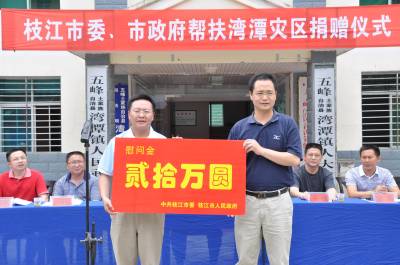 本报讯(通讯员永奎、张静)7月16日,枝江市向五峰土家族自治县湾潭灾区群众捐赠价值30万元的救灾款物。9日,湾潭镇遭受大暴雨袭击,24小时降雨超过180毫米,全镇受灾农户2478户,涉及9906人,造成直接经济损失近700万元。对口支援湾潭镇的枝江市获悉灾情后,紧急调集了价值10万元的大米、肥料以及20万元的慰问金,并在第一时间组成慰问团,看望慰问湾潭灾区干部群众。