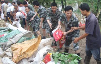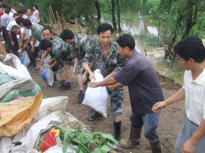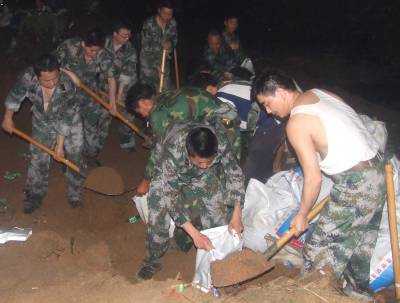 黄梅县人武部组织抢险应急7月15日下午13:30许,黄梅县濯港镇蔡埦村的考田河河堤溃口,溃口处达40余米,情况万分危急。黄梅县人武部迅速组织机关官兵职工和县民兵应急分队150余人,赶赴现场抢险,经过连续7小时的艰苦奋战,终于成功封堵溃口。(王敏、王政摄)