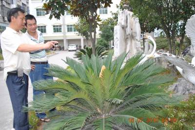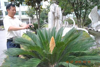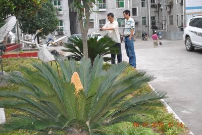 图文:两雄铁树同时开花十堰一单位办公楼院内,两雄两株并排而立的铁树30多年来首度同时开花,令人称奇。这两棵大小一样的雄铁树顶头长出一个外形像菠萝的桔黄色花冠,花瓣如鳞片,花冠高约60厘米。听说这里的两株雄铁树开花了,附近居民纷纷过来看稀奇,有的还欣喜地拿出相机为开花的铁树照了图片。(本报视界网徐雁初摄)