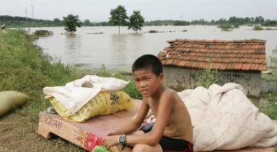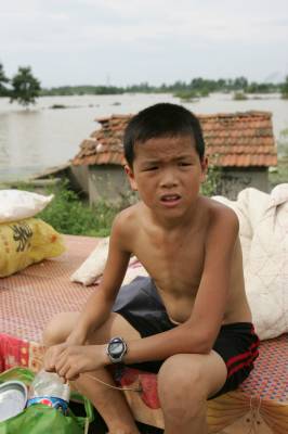 7月17上午,湖北咸宁市咸安区官塘乡渡船村一少年只身昼夜守护自家的鱼塘旁,等待着大水退去。自14日咸宁洪涝以来,广大受灾百姓在政府指导下,积极开展灾后自救恢复工作。