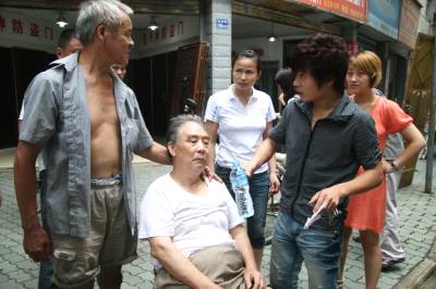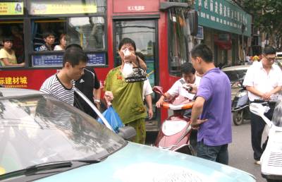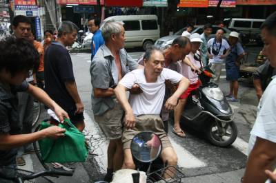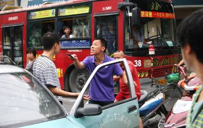 17日上午11时许,在汉口前进一路与民主一街交汇处,一辆的士与一电动车发生轻微擦碰,两车均未受损。骑电动车的男子下来后拉开的士车门,欲行抖狠(见图一)。一太婆见状便劝骑车男子,但其仍执意打手机邀人助阵。太婆无奈,见笔者正在拍照,便陡生一计,指着笔者大声道:”你看人家把你拍下来了!”(见图二)。骑车男子这才悻悻离去。11时30分,81岁的乔爹爹骑自行车在民意一路与一电动车轻微擦碰,乔爹爹慢慢地倒了下去。路人见状立即将乔爹爹搀扶起来(见图三),并找来椅子让其休息。骑电动车的肇事男青年赶忙去买来矿泉水,送给乔爹爹喝(见图四),并随后将乔爹爹送到医院做检查。张垠摄江汉区园林局43002213971281317