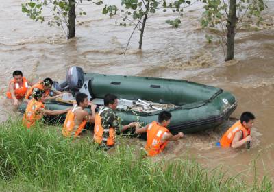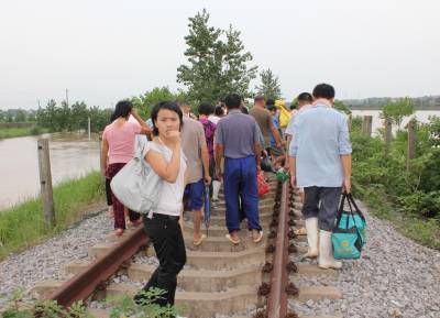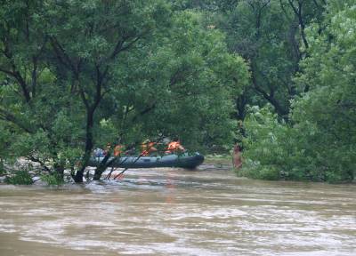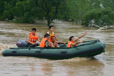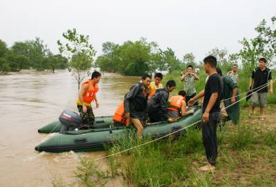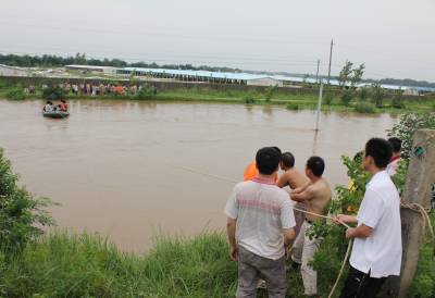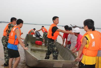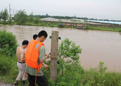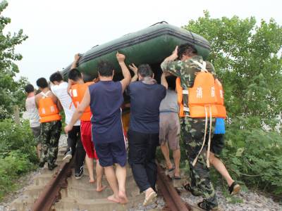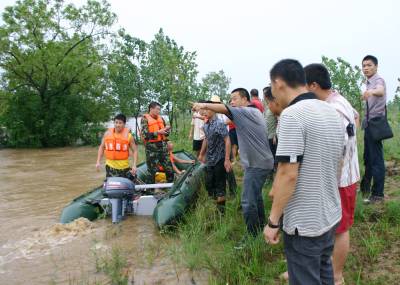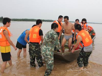 洪水中,孝昌消防战士及警民7小时倾情大营救通讯员宋俊初何山春韩绍刘炜军7月16日夜16分至17日早晨,一夜暴雨导致澴河孝昌段水位猛涨,该县开发区火星村一沙厂8名民工被困河滩树林;小河镇一民工被困断堤;花园镇一采沙船被洪水冲到陡山河段,6名民工被困;卫店镇武河村一种鸭厂38名员工被困。孝昌消防中队和孝感消防支队官兵联合救出被困者。1小时树林中救出8名被困民工17日早晨8时许,孝昌消防中队接到该县开发区火星村河段沙厂报警后,迅速赶到现场(图1)。战士们了解到,8名民工从凌晨1点受困洪水淹没的树林已经有8个小时,体力严重透支,必须尽快将他们救出。战士们组装好橡皮艇后,4名战士驾驶橡皮艇冲向流水湍急的树林,由于正值洪峰,才冲不远就被冲到了下游。指挥员重新组织战士从上游下水,顺流进入树林后,发现6名民工正站在洪水中,双手抱着大树。战士们先将5人救上岸后,又返回树林中,将另外1名民工救了起来(图2、3)。民工们告诉战士们,他们17日凌晨1时加固挖沙船时,突然洪峰到来将船冲向下游,当船被冲到树林边时,8人先后跳了下来。消防战士又驾驶橡皮艇冲进树林,终于在下游方向找到了最后2名被困者。8点54分,最后2名被困民工成功获救(图4、5)。市县消防战士齐心营救2处河段被困民工17日上午,孝感市消防支队接到孝昌消防中队求援后,支队领导带着冲锋舟赶到孝昌,协力进行小河断堤和陡山沙船被困民工营救。17日上午9点30许,孝感市消防支队和孝昌消防中队战士,和小河镇堰口村村民一起,将冲锋舟抬到了该村漫水桥头(图6)。在澴河的西岸堤坝上,堰口桥工地看场民工刘四清被突然到来的洪峰围困,仅剩的一段残缺堤坝被在洪水的冲刷下迅速坍塌,刘四清随时都会被洪水卷走。战士们在一位当地会水性和熟悉地形村民的引领下,驾驶冲锋舟避开被洪水淹没的漫水桥后,终于冲到了残堤边。9点50分许,刘四清被战士们成功营救上岸。11点50分许,孝感市消防支队和孝昌消防中队战士,又来到陡山乡陆光村河沙厂(图8)。这里有一艘从上游冲下来的挖沙船,上面有5名民工被困。战士们立即驾驶冲锋舟,向前方500米处河心被困的挖沙船冲了过去(图9)。12点10分许,5名被困民工获救。种鸭厂38名员工被洪水围困孝昌消防中队官兵成功救出7月17日中午,孝昌线卫店镇武河村种鸭厂38名员工,被困该村铁路以西河滩厂区,不断上涨的洪水已经将厂区包围,四周都是湍急的流水,几名水性较好的男员工几次下水突围无果,只好报警求救。13时许,孝昌消防中队战士赶到武河村后,发现该村铁路附近一个自然湾的房屋已经被淹,洪水仍在上涨。战士们立即推着橡皮艇向铁路方向进发(图11)。一到铁路边才发现,必须穿越一座新铁路桥和2座废弃的铁路桥才能到达西边的河滩,而洪水水面离桥底部只有不到60工分高。指挥员和该县公安局领导决定用橡皮艇载战士穿过3座大桥后,再制定营救方案(图12)。橡皮艇到达铁路以西后,发现水流十分湍急。根据被淹没的电杆来看,水深至少有10米。战士们只要沿废弃的铁道边,推拉着橡皮艇艰难地往前走。由于体力消耗大,指挥员观察地形后,让战士们和卫店镇政府工作人员一道,将橡皮艇抬上废弃的铁道(14)。从铁道上将将橡皮抬到种鸭厂上游后,战士们驾橡皮艇带绳索到种鸭厂的另一端(图15),在两端架起绳索辅助,东西拉艇往来救人(图16)。14点20分,经过消防官兵和卫店镇政府、卫店派出所民警的共同努力,被困的38名员工全部获救。