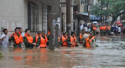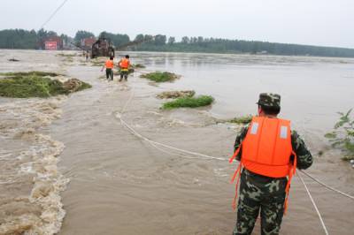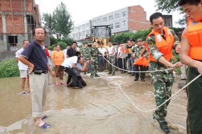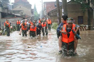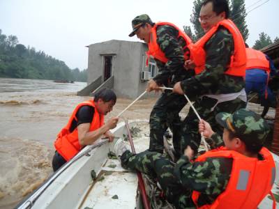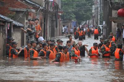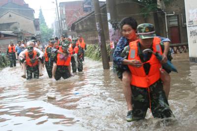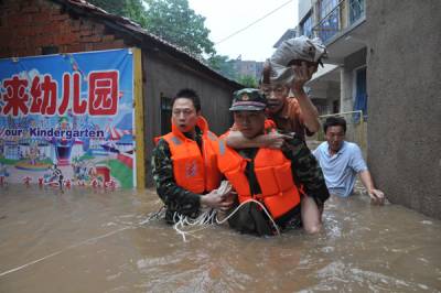 湖北随州遭暴雨侵袭 消防官兵洪水中营救被困群众