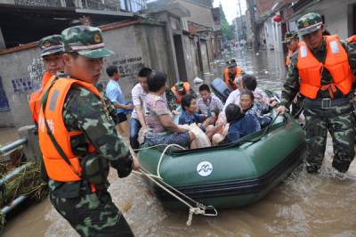 湖北随州遭暴雨侵袭消防官兵洪水中营救被困群众7月17日,消防官兵在广水市应山办事处东大街解救和疏散被困群众。7月17日0时37分截止7月17日12时,随州市遭受强降雨袭击,最大降雨量达250多毫米,导致随州、广水、曾都等部分乡镇交通中断,人员被困。公安消防支队共出警24次,其中抢险救援22次,火灾扑救2次,抢险救援中有21次为抗洪抢险,抗洪抢险中共出动26车次,共出动158人次,共救出被困群众461人,疏散被困群众388人。本报视界网杨文明李国刚摄