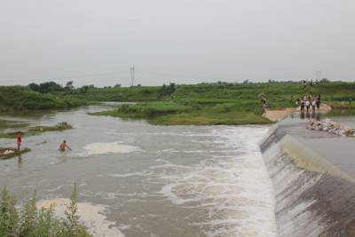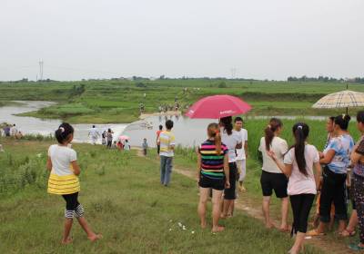 孝昌县花西乡建二村14岁女孩张培,17日下午在回家途中,在刘王村漫水坝涉水时,被急流冲到坝下。虽然该乡政府、派出所及刘王、建二村干部群众,和该县消防中队战士多方打捞,仍不见失踪者身影。7月18日上午,笔者来到刘王村漫水坝东头,尽管坝面的水消退不少,但仍漫过脚踝。刘王村5五旬老妇张自告诉笔者,17日下午1点30许,她正在坝东头的草坡上放牛,突然看见坝上有一名提着塑料袋的女孩在涉水过河,连忙喊:”危险,不能过,回来!”。女孩刚走两步,脚下一滑,被急流卷到了坝下的深潭中。刘王村支部书记听到放牛老人张自的呼救声后,立即带着十几个村民赶到漫水坝,由于水流湍急,且坝下的水潭很深,潜水村民根本无法探底,只在潭边的浅水区,捞起女孩的一双凉鞋,和装着补课书本的塑料袋。该乡乡政府、派出所获悉这一情况后,也迅速组织干部和民警到现场打捞。18日上午,尽管乡政府干部、派出所民警、消防中队战士及当地村民20多人下水探摸、拉网等,但由于潭深水急无法沉底,不见失踪女孩的踪影。通讯员宋俊初摄