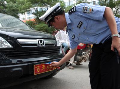 7月18日,荆门市交警支队支队长阳勇在城区执勤时,将一队婚车拦停,将贴在车牌上的”百年好合”全部撕下。眼下婚车遮掩车牌似乎成了惯例,但这样有意遮掩牌照违反了交通法规。本报视界网陈旭摄