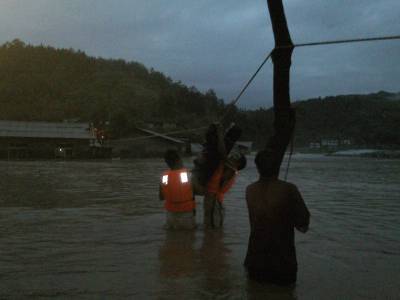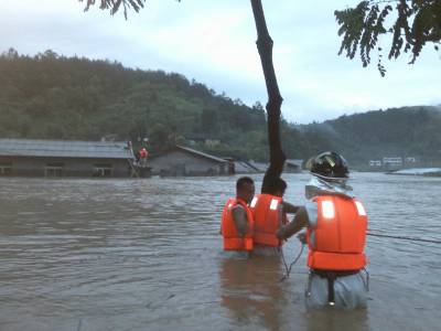 图文:特大暴雨袭击鄂西北十堰四镇居民紧急大转移18日下午15时许,郧西县消防大队接县政府指令后,大队长喻成鄂立即带领10名消防官兵会同县政府、民兵赶赴郧西县羊尾镇。一路上,暴雨持续不停,汉江沿线有10余艘采沙船停靠在河道边作业,消防官兵在郧西县委书记叶战平的指挥下,通过喊话的方式,积极劝导采沙船只靠岸,疏散人员30余人。下午17时,经过长途奔袭,消防官兵到达羊尾镇,根据县委书记叶战平的部署,所有参与救援人员分成2组,分别赶往夹河、羊尾两镇进行群众转移,并且将物资转移到安全地带。截止19日上午发稿时,转移仍在进行中。(本报视界网徐雁初通讯员辛百顺摄)18日下午19时,竹溪县平均降雨量达78mm,强降雨致使河水上涨、山体滑坡、泥石流等自然灾害发生。当日下午17时,连日的暴雨导致该县水坪镇和县河镇三处近100余名群众被困。接到求助后,该县消防大队迅速出动,带上救生衣、安全绳火速赶往救援现场,截止当晚23时许,成功救出所有被困人员。(本报视界网徐雁初通讯员帅建强摄)