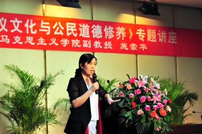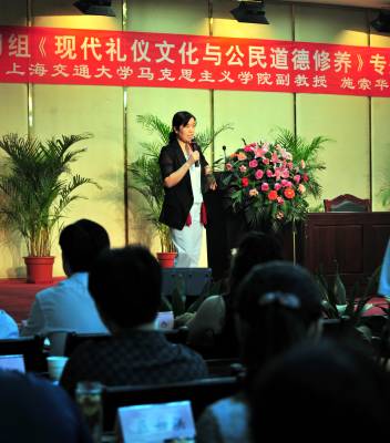 2010年7月19日,上海交通大学马克思主义学院副教授施索华应邀来到湖北省宜昌市,为夷陵区400多名党政及社区干部作《现代礼仪文化与公民道德修养》专题讲座。 施索华副教授纵贯古今,兼纳中外,从”礼仪道德的基本内涵”、”践行礼仪道德的基本要求”、”如何提升礼仪道德水平”等方面传授了现代礼仪文化与公民道德修养,让在场观众深受启发,纷纷表示将带领本单位本部门系统学习公共文明礼仪知识,掀起”学礼仪、创文明”热潮。本报视界网张国荣摄