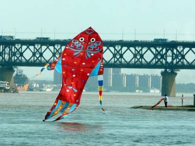 7月18日下午,在湖北省武汉市长江汉江两江交汇处的汉阳南岸嘴江边,市民冒着高温,借着江风,放起了红色鲤鱼的风箏,犹如鲤鱼在两江交汇处跳龙门,美不胜收。