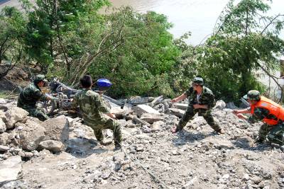 20日下午15时,郧西县夹河镇望江亭附近公路由于路基受到洪水浸泡多处发生坍塌,有三辆摩托车随同坍塌的路面跌入十米深的悬崖,由于此时通往外界的地段多处发生坍塌险情,没有相应的救援机械可利用,消防官兵在利用木棒撬开压在摩托车的大石块后,在车身的头部和尾部分别系上绳索。当日下午17时,在他们的努力下,被压摩托车终于被拖到了安全地带。(本报视界网徐雁初通讯员喻成鄂摄)