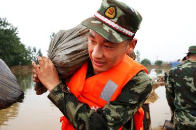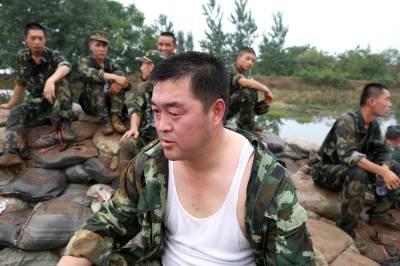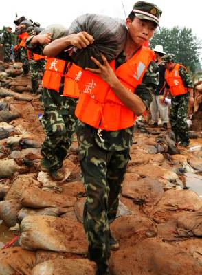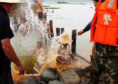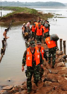 7月20日傍晚,军民合围被洪水冲垮的滨湖围堰堤。连日来的强降雨,导致湖北咸宁市咸安区官埠镇滨湖围堰被淹,并将距滨湖排涝站80米处的围堰堤冲垮。为解数千亩良田及养鱼池被淹的燃眉之急,7月20日,武警官兵、民兵预备役、公安干警和当地群众共500余人组成抗洪抢险突击队,采取打桩定位充填土袋的方式合围被洪水冲垮的滨湖围堰堤。经十几个小时的连续奋战,当晚21时30分围堰堤成功合围。