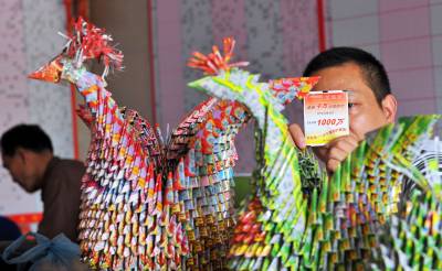 7月21日,樊城人民广场一福彩投注站,一名彩民在用福彩”刮刮乐”叠成的工艺品后面观察彩票号码。记者从在襄樊市召开的全省福利彩票年中分析暨网点即开票户外销售现场会上了解到,襄樊市上半年福彩销售达1.24亿元,为社会筹集公益金3900多万元。