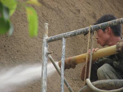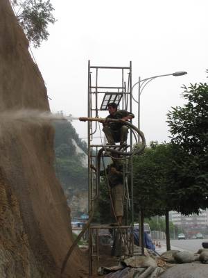 2010年7月21日,专业山体绿化治理人员在十堰市城区上海路为裸露的山体喷播花草树种。十堰有”山城”之称,由于山多,拓展空间受限,通常要平山建房,挖山修路。也由此导致许多山体裸露,满目疮痍。今年该市市政园林绿化管理局对城区的10条主干道两侧的97处裸露山体进行治理,再现山体一片葱绿。(十堰日报摄影部曹忠宏摄影报道电话13294212877)