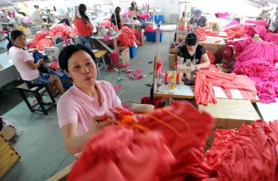 昨日,服装加工车间里一遍繁忙的景象,这里的员工越来越多,当地农民工有了更多的返乡务工的机会。荆州市荆州区岑河镇引导针纺企业发展壮大,目前,小镇上拥有相关企业200多家,提供16000多个就业岗位,当地许多农民工纷纷返回家乡,在家门口找到满意的工作岗位。(记者杨平摄)