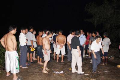 7月22日下午,广水市太平乡红旗村环河支流发生翻船事故,11名民工落水,孝昌王店镇政府及王店派出所民警,全力协作广水太平乡政府及警方全力搜寻失踪者。当晚20时许,记者来到孝昌与王店接壤的王河大桥西边,见广水市太平乡政府工作人员、派出所民警及广水市消防大队官兵,载着冲锋舟来到桥附近的环河河滩,找到合适的位置后,在红旗村一名熟悉水情和地形的村干部的带领下,顺河寻找失踪者;而在环河下游1公里处的孝昌王店桥上游,孝昌王店镇政府及王店派出所民警,正由南往北沿河寻找失踪者。记者在离广水太平街不远的环河支流临时渡口看到,是几个村民仍站在渡口望河心眺望,河水十分湍急。一名正在哭泣的妇女告诉记者,她叫黄自清,今年55岁,是失踪者颜翔杰(音)的二妈。下午17点40许,颜翔杰和其他10名民工乘渡船过河,到河对岸的群益村去架设电线,不料在河心发生翻船,有7名民工被救上岸,颜翔杰和其他3名民工失踪。当记者向红旗村一名村干部证实失踪人数时,该名村干部说,渡船上的确有11名民工,但到目前为止,他也不清楚到底几人失踪,目前有村干部正在统计。宋俊初摄