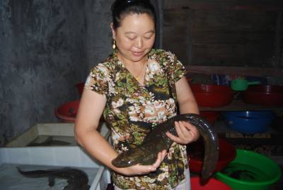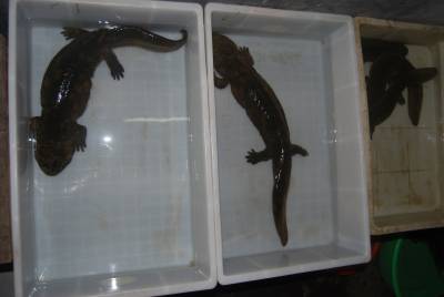 7月23日,宣恩县桐子营集镇的龙碧英抱起一条6斤重的大鲵(娃娃鱼)(图一)给我们介绍说,她家用优质天然水源、活的小杂鱼、塑料盆在室内养殖大鲵(图二)已上10年,年卖大鲵100多条,收入几十万元。据了解,宣恩县共有大小河流100多条,水质优良,鱼儿嬉戏。目前全县有2000户利用当地丰富的优质水源,用活的小杂鱼、小虾、小泥鳅作饵料,在户外建池或在室内用塑料盆、泡沫箱养殖大鲵,年养殖大鲵10.5万尾,主要销到陕西、上海、浙江、福建、重庆、四川等地,年销售收入3000万元,成为全省产销大鲵最多的县市,初步建成”湖北大鲵之乡”。(签约摄影师汪盛华)