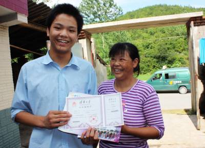 7月23日下午,南漳县肖堰镇观音堂村高考生苏中旭接到清华大学录取通知书,那种激动的心情难以抑制,他和母亲都笑拾不拢嘴。今年高考,苏中旭文科考出607分的优异成绩,位居襄樊市文科第4名。图为苏中旭和母亲在一起细看录取通知书。张兴江/摄