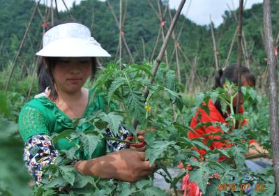 7月23日,家住咸丰县黄金洞乡五谷坪村的土家族女孩王珊正在为番茄绑蔓。王珊刚刚初中毕业,她所在的村有200亩地被人承包下来种植番茄和辣椒等高山反季节蔬菜,她和伙伴们到地里干活每小时可以和大人一样得到5元的报酬,最多的时候她一天曾挣到40元。本报视界网周光兵邓永勤邵贞溪摄恩施日报社记者部周光兵13277584567