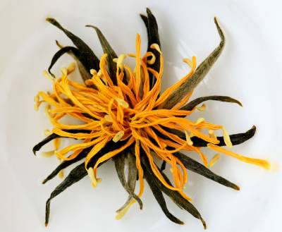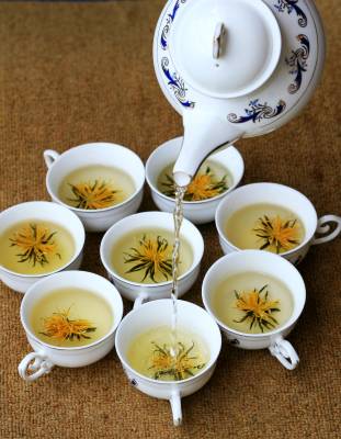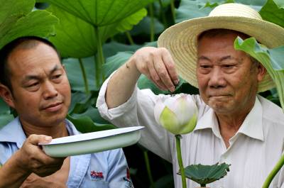 73岁老人研制的莲花茶获国家发明专利 7月25日,竹山县城关镇刘家山村陈德润(右),和村民一起趁日出前将绿茶放进正在开放的荷花。今年73岁的陈德润,受《茶经》一书启发,从2001年以来潜心研制用绿茶与鲜荷花组合制成的”莲花茶”。莲花开放时节,日出前将绿茶放进荷花蕊,然后将花朵用皮筋轻轻缚住,次日将花瓣、花丝、绿茶一同摘下,再用特殊地焙制方法焙制。陈德润的莲花茶,因特殊地配制方法和独特的品质,先后获国家发明专利证书,并被湖北省农业厅认定”无公害农产品产地”。陈德润介绍:由于莲花茶制作工艺复杂,今年的产量有500公斤,可收入50万元。他计划明年在扩大莲藕面积的同时,再扩大莲花茶生产规模。