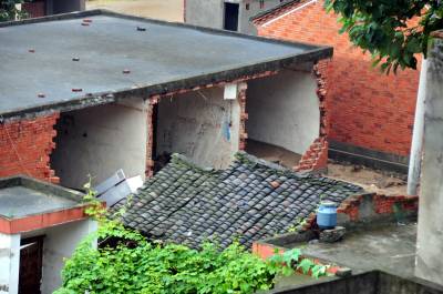 7月24日连日降雨和陕西省丹凤水库开闸泄洪给湖北省郧县与河南交界的口子镇丹江沿岸的白浪镇,刘洞镇,谭山镇遭受百年不遇的大洪水,仅半天多时间丹江水位疯长10米,造成3镇1000多幢房屋被洪水冲走或成危房.仅谭山镇腰庄村就转移215户989名村民进入村小学和山上房屋安置,该镇被冲走农田1985亩,林木463亩两条通外省公路各冲毁1.5公里和2.8公里,被转移村民家产,粮食,牲畜全被洪水冲走,损失达5000多万元.图1为25日洪水退去后的场景.图2为一村民家房屋后砖墙倒塌家户被洪水冲光时的情景.周家山魏明成摄湖北省郧县城建监察大队电话13872840078邮编442500