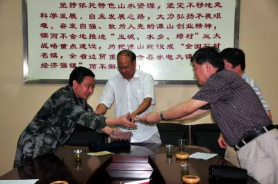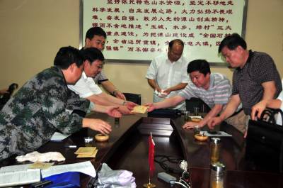 7月25日,湖北省十堰市副市长师勇学带领民政,土地等部门领导赶赴郧县查看24日被丹江洪水冲毁最严重的谭山镇腰庄村,在查看被冲毁房屋现场后将带各部门带来的6万元现金交给谭山镇政府,请谭山镇政府将现金发给灾民,并安排好灾民生活和住宿,当天下午谭山镇1000多无家灾民每人领到100元救济金.图为十堰市各部门领导(右)将6万元救灾现金交到谭山镇领导(左)于中时的情景.周家山魏明成摄湖北省郧县城建监察大队电话13872840078邮编442500