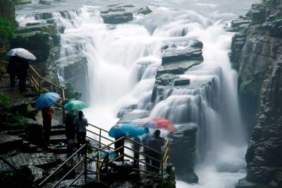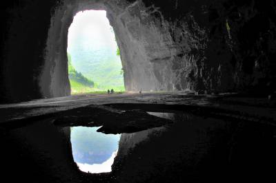 一批来自浙江、山西、广东的游客冒雨欣赏腾龙洞大瀑布。湖北恩施自治州利川腾龙洞位于清江上游利川市近郊,距利川市城区6.5公里,属地文景观类风景区。腾龙洞由水洞、旱洞、鲇鱼洞、凉风洞、独家寨以及三个龙门、化仙坑等景区组成,洞中有山,山中有洞,水洞与旱洞相连,主洞与支洞互通,集山、水、洞、林于一体,以雄、险、奇、幽、秀的神奇风光和独特魅力而驰名中外。洞口垂直高度74米,宽64米,洞长52.5公里,该洞穴系世界特级溶洞之一,位居世界第七,亚洲第一。清江至此跌落形成”卧龙吞江”瀑布,水声如雷吼,气势磅礴。步入洞中,极品的自然奇观、大尺度空间效果的激光电子剧场和大型原生态歌舞”夷水丽川”等,游客不仅可以观赏到鬼斧神工的大自然造化,感受到当今高科技的冲击波,还可以体验到原始野趣的乡土歌舞和亲身参与的快乐。2005年10月,腾龙洞被中国地理地质界、风景旅游界最具权威的国家级刊物《中国国家地理》评为”中国最美的地方”。