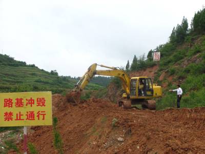 郧县抢修临时通道恢复丹郧路交通(通讯员:柯常武单位:十堰市郧县安阳镇政府邮编:442515电话:15571900508)7月25日上午,施工队正在为已经中断交通3天时间的丹郧路k104+550处修建临时通道。7月22日,位于安阳镇境内的省道丹郧路k104+550处长50米、深10米、宽9米的路面路基被山洪冲毁。因原路修复需用较长时间,郧县交通部门决定先抢修一条临时通道,力争尽快恢复丹郧路交通。