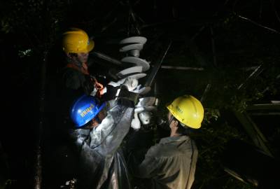 7月23日17时26分,京广铁路运输大动脉湖北咸宁贺胜桥变电牵引站供电线路--110千伏塘铁线80号铁塔上绝缘瓷瓶遭强大雷击,导致线路跳闸停电。咸宁供电公司立即组织20余人抢修队,冒着大雨,迎闪电,在短短4小时内恢复线路。确保京广铁路大动脉的畅通。