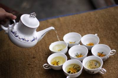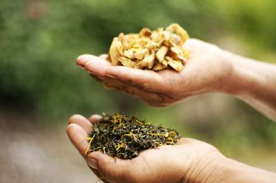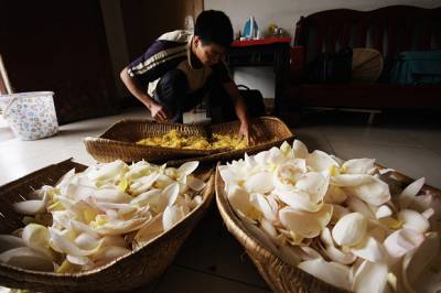 竹山莲花茶,传统农业的华丽转身”气温升高后,荷花中的清香气被茶叶吸收,过24小时后拿出来,再把烘干的莲须按茶叶、莲须6:4的比列制成花瓣样式,莲花茶就制成了,这是一种精致制法。”7月25日,竹山县润兰庄园庄主陈德润介绍莲花茶制作过程时说:”还有一种普通制法,就是把花瓣烘干后,按上述比列混合即成。”73岁的陈德润家住竹山县城关镇刘家山村,受《茶经》一书启发,从2001年以来潜心研制用绿茶与鲜荷花组合制成莲花茶。莲花开放时节,日出前将绿茶放进荷花蕊,然后将花朵用皮筋轻轻缚住,次日将花瓣、莲须、绿茶一同摘下,结合现代制茶工艺焙制而成。因特殊地配制方法和独特的品质,先后获国家发明专利证书,并被湖北省农业厅认定”无公害农产品产地”。刘家山村地处霍河水库之畔,水源充沛,土壤肥沃,日照充足,适宜种植茶叶、莲藕。2001年陈德润试制莲花茶以来,随着产量的逐年增加,带动周围农户种植莲藕的越来越多。夏天农户把莲须、花瓣卖给茶场,秋天收获莲藕,两项相加,每亩净增300多元。”今年夏天可生产500公斤莲花茶,产值50万元左右。十堰、襄樊、武汉、西安等地的客商上门订购,供不应求。”陈德润深情的说:”明年农户莲藕种植面积增加的话,我想把产量提高到600公斤。让农民地下的(莲藕)能变钱,地上的(荷花)也能变钱,一藕多卖,互利双赢。”莲花茶的研制,是竹山传统农业的华丽转身。有了莲花茶,过去不成规模很难作为商品的荷花价值也得到认可,农民增收致富又多了一条新的渠道。(本报视界网章磊摄)图片:1、将制好的茶叶放入花瓣中,用橡皮筋将花瓣轻轻缚住。2、莲须、花瓣分开备用。3、上为尚未烘干的花瓣,下为制好的普通莲花茶。4、技术人员在一起查看茶叶成色。5、烘干花瓣。6、冲泡。7、清香扑鼻的莲花茶。8、陈德润展示莲花茶发明专利证书。地址:竹山县交通局章磊电话:15972574118