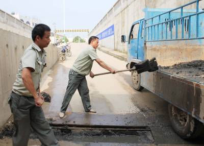 7月25日孝昌遭受”砣子雨”侵袭后,积水携带大量的泥沙,将连接该县新老城区站前一路南涵洞、西洪花路中涵洞和古城大道北涵洞淹没,淤积的泥沙堵塞了排水槽中的泵头,给抽排工作带来较大的难度。图为26日下午,孝昌县城管队员在清理西洪花路中涵洞排水槽中淤积的泥沙。宋俊初摄