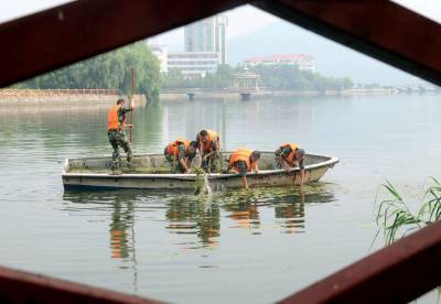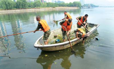 武警官兵清垃圾26日,武警黄石市边防检查站的官兵在磁湖山庄湖面清理杂草、垃圾。为迎接该市首届矿冶文化旅游节和建市60周年,以优雅干净的环境迎接四面八方的客人,边防检查站的武警官兵开始对磁湖水面的杂草、垃圾进行清理,同时打扫磁湖山庄周围的环境卫生。黄石市黄石日报摄影部邱孝威摄电话:13807232603邮编:435002