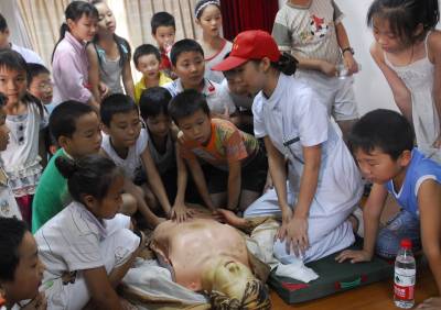 26日,宜昌市中心医院的团员青年医护人员,为张家店社区的农民工子弟送来暑假期间的健康急救知识,针对暑期的溺水事故较多,医生手把手培训孩子们对溺水者的抢救技巧。